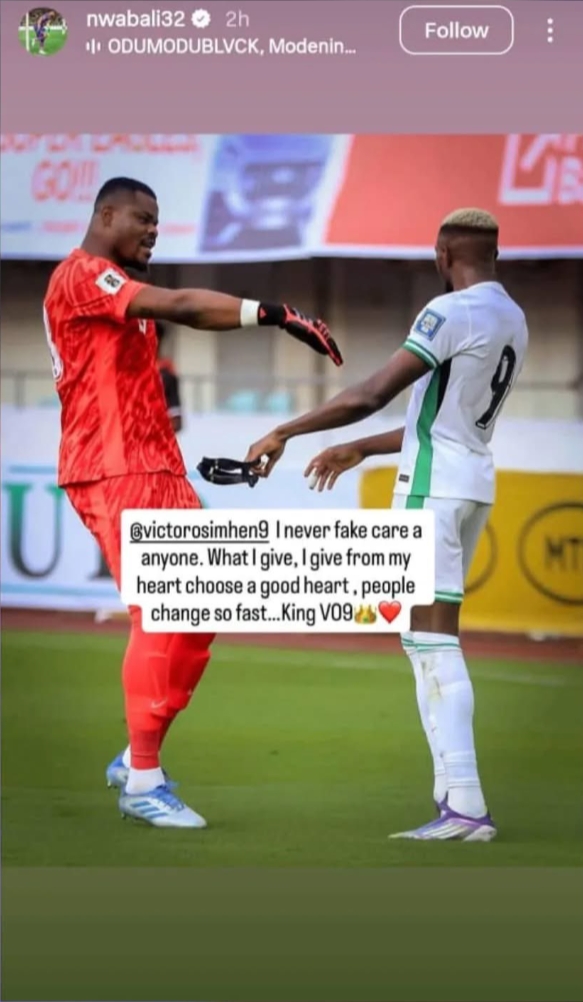 Stanley Nwabali’s post came only days after a heated on-field moment during Nigeria’s 4-0 win over Benin Republic in a 2026 World Cup qualifier.