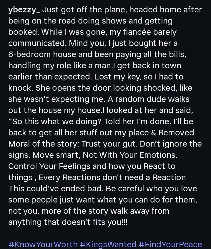 According to Bezzy, his fiancée, whose identity remains undisclosed in the post, barely communicated with him despite his schedule with shows and bookings.