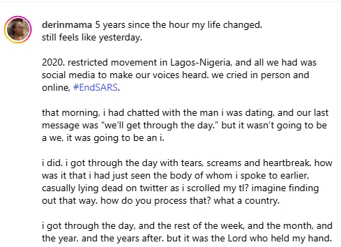 As Nigerians commemorate the fifth anniversary of the #EndSARS protest, Derin, the girlfriend of late product designer Oke Obi-Enadhuze, has shared an emotional reflection on how his tragic demise transformed her life.