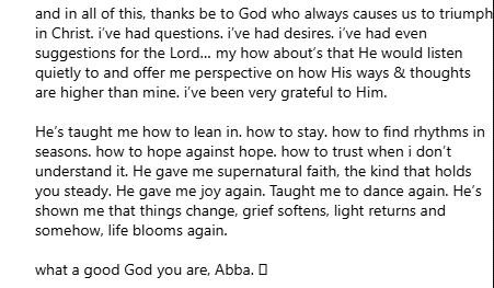 He’s taught me how to lean in. how to stay. how to find rhythms in seasons. how to hope against hope. how to trust when I don’t understand it. He gave me supernatural faith, the kind that holds you steady. He gave me joy again. Taught me to dance again. He’s shown me that things change, grief softens, light returns and somehow, life blooms again. What a good God you are, Abba.”