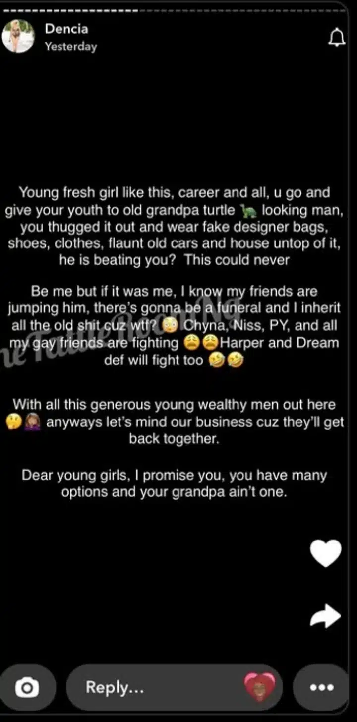 “Young fresh girl like this, career and all, u go and give your youth to old grandpa turtle looking man, you thugged it out and wear fake designer bags, shoes, clothes, flaunt old cars and house untop of it, he is beating you? This could never Be me but if it was me, ! know my friends are jumping him, there’s gonna be a funeral and | inherit all the old shit cuz wit? Chyna,Niss, PY, and all my qy friands-are fighting Harper and Dream def will fight too