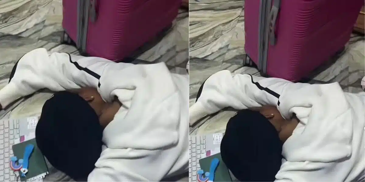 In a video shared on TikTok by @jokotade, she had dressed up and packed her bags, including her passport, to prophetically act out her relocation miracle to the USA, but ended up dozing off with her luggage beside her before the session even ended.
